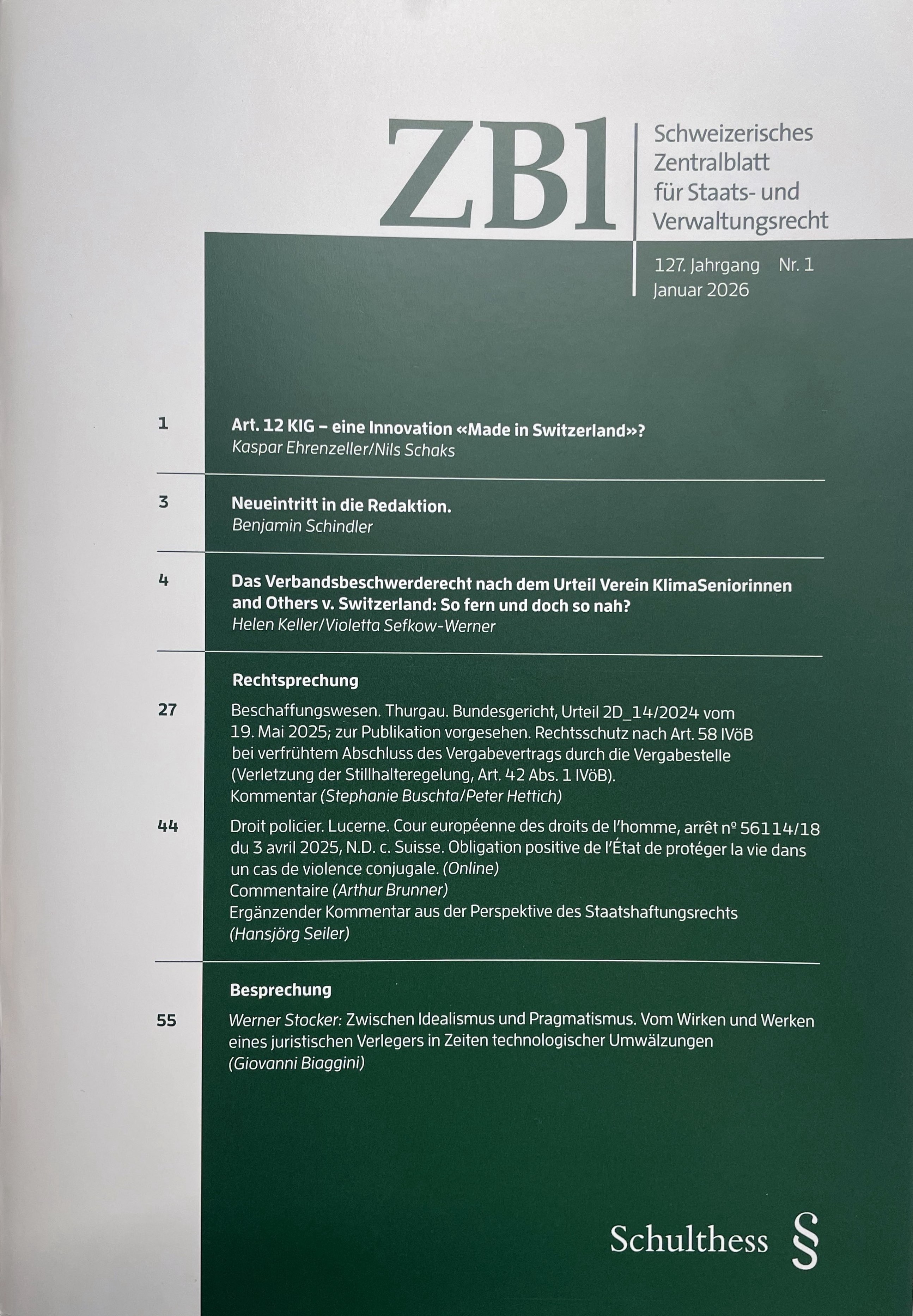Prof. Keller und Violetta Sefkow-Werner haben "Das Verbandsbeschwerderecht nach dem Urteil Verein KlimaSeniorinnen and Others v. Switzerland: So fern und doch so nah?" im Schweizerischen Zentralblatt für Staats- und Verwaltungsrecht (ZBl 01/2026) veröffentlicht.